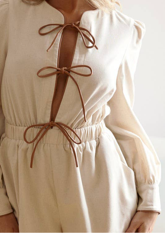 HEATHER LONG SLEEVE LINEN BOW ROMPER - CREAM