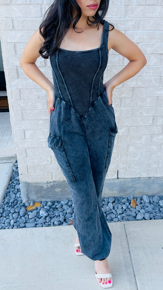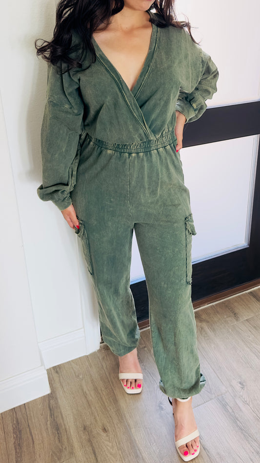 BECKY MINERAL WASH JUMPSUIT - OLIVE GREEN