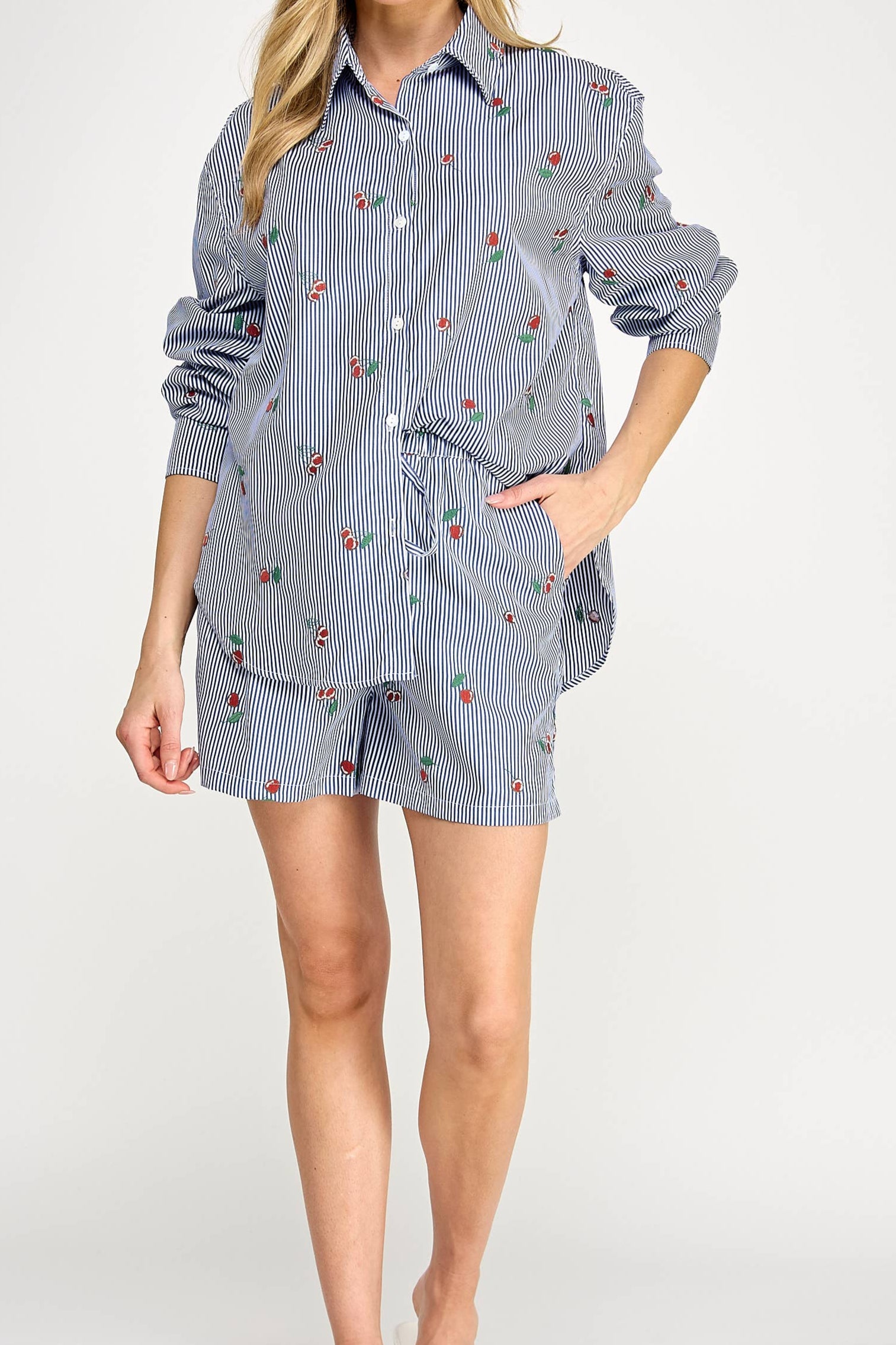 Stay fresh and stylish this summer in our navy and white striped button-down collared shirt and matching shorts set! Featuring cute, embroidered cherries and a comfy elastic waistband, this set brings the perfect elevated summer look. Ideal for Fourth of July celebrations, beach days, brunch dates, and everything in between. Dress it up or keep it casual — this is your go-to outfit for effortless summer vibes!